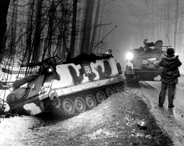 Near Giessen, Germany, January, 1985: An armored personnel carrier from 3rd Sq., 8th Cavalry is hauled