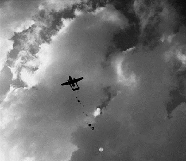 parachutists jump from a C119 "Flying Boxcar" during festivities