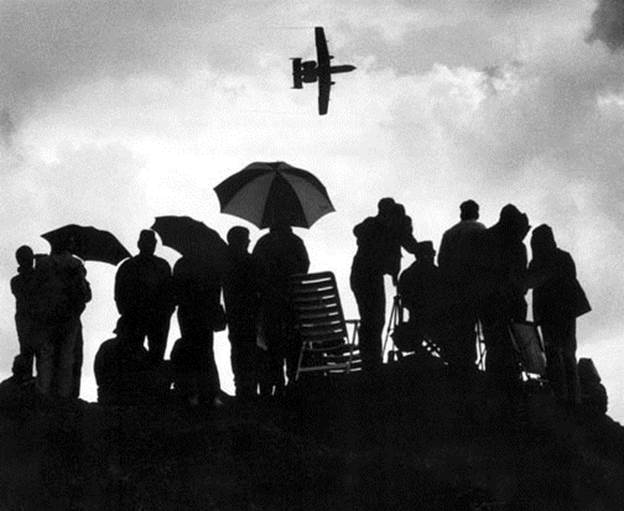 over spectators huddled under umbrellas near the runway during the annual Flugtag open house day at Ramstein.